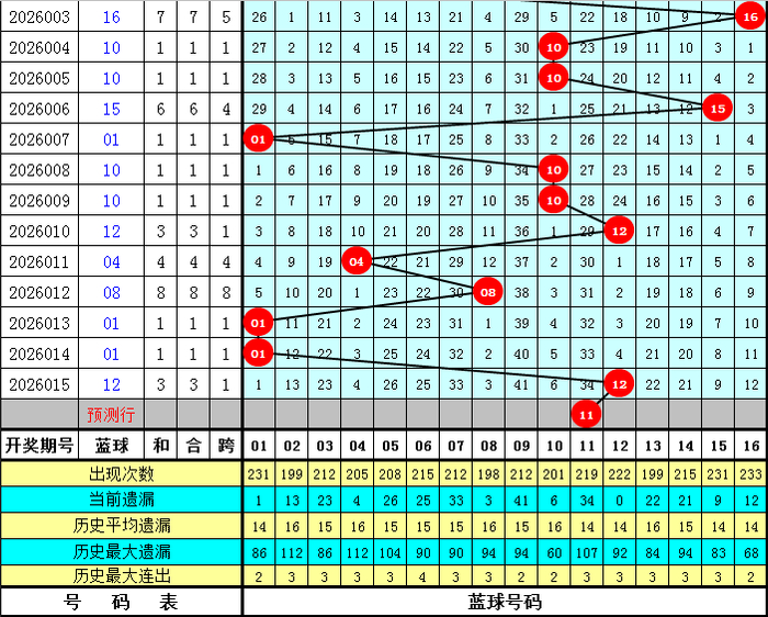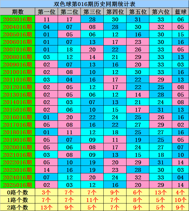 蓝球:历史同时0路号开出:03、06、15;1路号开出;04、07、10、13、16;2路号开出;02、05、08、14,蓝球012路个数比为4:10:9,昨年同时开出2路蓝球之后,本年同时防2路号再出,参考蓝球11。