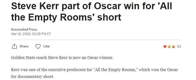 金州豪杰队主评释注解史蒂夫・科尔也成为了奥斯卡奖得主。科尔是记载片短片《静室为证(All the Empty Rooms)》的扩充制片东谈主之一,该片荣获2026年奥斯卡最好记载短片奖。