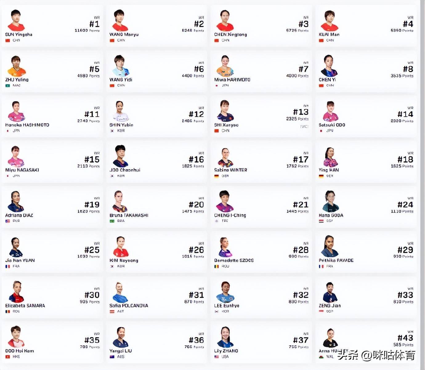女单:孙颖莎、王曼昱、陈幸同、蒯曼、王艺迪、陈熠、石洵瑶