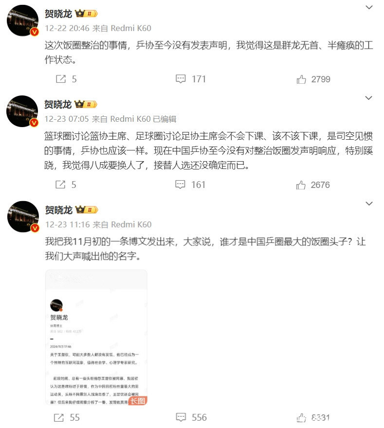 是以在国乒按捺了统统2024年的一皆赛程之后,体育局从上至下启动整顿乒乓球“饭圈文化”,关系词知名记者贺晓龙却从22日于今,连发几条动态直言“刘国梁依然下课了!”这径直让刘国梁乃至统统中国乒协在近几日备受珍视,贺晓龙先是在22日发表言论宣称:“此次整治饭圈,中国乒协于今莫得发表声明,我以为这是群龙无首、半瘫痪的责任景象!”紧接着23日宣称:“篮球圈征询篮协主席会不会下课、足球圈征询足协主席该不该下课,都是司空见惯的事情,是以中国乒协也相同,现如今统统中国乒协都未出头对整治饭圈发声明反应,这件事情相称蹊跷,我以为概况是要换东说念主了,仅仅接替东说念主选还没细则费力!”再之后,贺晓龙翻出11月初他写的一篇著述,直指中国乒乓球圈子之是以充斥着“饭圈”,并非王楚钦之过,而是刘国梁为国球寻找市集化将路走偏了!这篇著述言辞狠恶,其时在乒乓圈内产生了很大影响,于是“刘国梁被传下课”的音书,席卷了近几日的乒乓球热搜榜